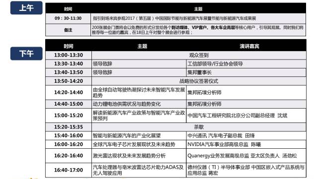 演讲嘉宾除了集邦咨询和集邦咨询旗下拓墣产业研究院的专业分析师之外,还有Quanergy Systems Inc亚太区&中国区负责人汤劲松先生,德州仪器半导体事业部中国区嵌入式产品系统与应用总监蒋宏先生,NVIDIA汽车事业部高级总监陈曦先生,中兴通讯汽车电子副总裁田锋先生,中国汽车工程研究院北京分公司副总经理沈斌先生。具体议程见下表: