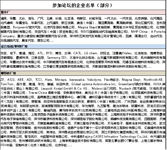 目前,已经有多家企业积极报名参与,小编拉取了整车厂、动力电池/BMS厂商、零部件厂商部分企业名单(不完整),详见下表: